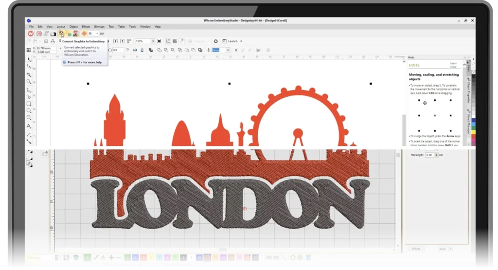 Mit einem einzigen Klick können Sie Ihre Wilcom .EMB-Stickdateien in eine CorelDRAW®-Vektordatei konvertieren, um sie für den Digitaldruck, den Siebdruck oder jedes vektorbasierte Logodesign zu verwenden. Verkaufen Sie mehr an Ihre Kunden!