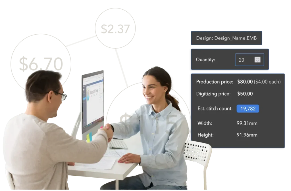 Generieren Sie sofort visuelle Darstellungen von Stickereidesigns und Produktionspreisen, damit Sie direkt vor Ort Angebote erstellen können. Dies stärkt das Vertrauen der Kunden, verbessert die Effizienz Ihrer Dienstleistungen und führt zu mehr erfolgreichen Interaktionen.
