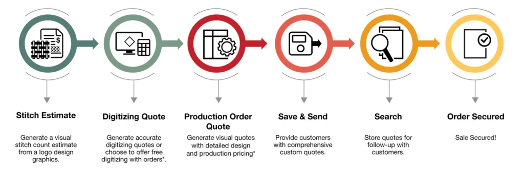 Estimator ist auf Teams und Abteilungen mit direktem Kundenkontakt zugeschnitten, die sofort den Wert eines Stickereiauftrags berechnen können. Ganz gleich, ob Sie Vertriebsmitarbeiter, Kundendienstmitarbeiter oder Teil des Verwaltungsteams sind, Estimator macht professionelle Stickereiangebote zum Kinderspiel.